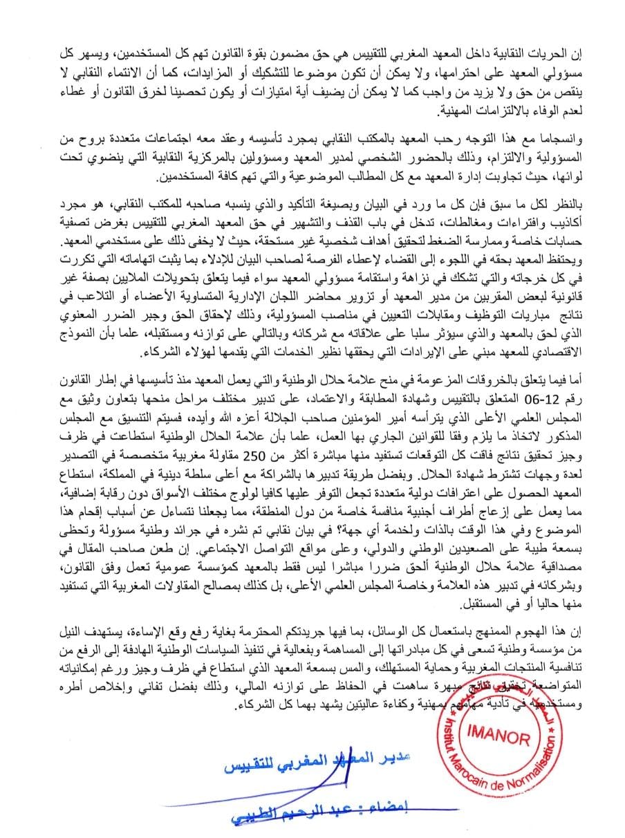 وجاء في البيان التوضيحي للمعهد المغربي للتقييس أن ما نُشر في المقال المعني “يتضمن معطيات غير دقيقة ولا تعكس الوضع الحقيقي داخل المؤسسة”، مؤكدًا أن “العمل داخل المعهد يسير في أجواء مهنية سليمة، وفق ما تقتضيه الضوابط الإدارية والقانونية، وأن باب الحوار والتشاور مفتوح مع جميع مكونات المؤسسة”.