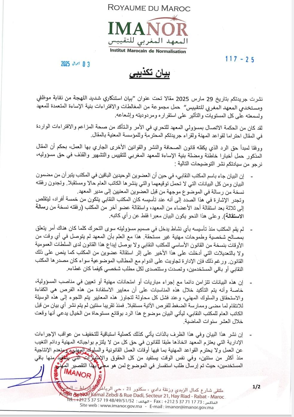 عملاً بمقتضيات قانون الصحافة والنشر، ولا سيما ما يتعلق بحق الرد، توصلت جريدة [زناتة24] ببيان حقيقة صادر عن المعهد المغربي للتقييس، وذلك بخصوص المقال الذي تم نشره على صفحاتنا بتاريخ 29 مارس 2025، والذي حمل عنوان: “بيان استنكاري شديد اللهجة من نقابة موظفي ومستخدمي المعهد المغربي للتقييس”.